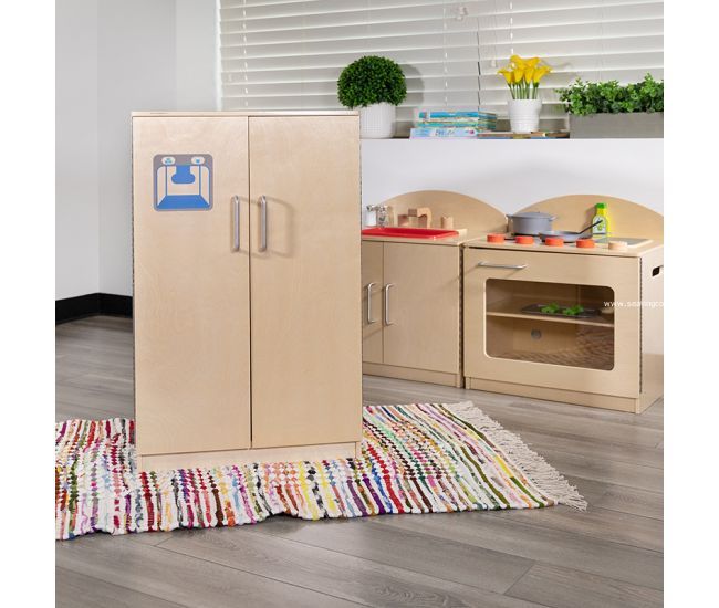 Pretend play is an essential part of a child's growth that helps to support social and emotional development. This wooden kitchen refrigerator will encourage imagination and creativity and will teach sharing when playing with others. This wooden pretend play refrigerator has an ice maker and water dispenser graphic and 2 fixed interior shelves to put away the leftovers from the fantasy dinner they prepared or stow pretend food and pots and pans when not in use. Durable birch plywood with a neutral finish adapts to any home or business decor. Use an alcohol disinfectant containing 70% or higher alcohol concentration followed by a dry cloth to keep this wood play refrigerator clean. This pretend side by side refrigerator assembles in about 30 - 60 minutes. Self leveling floor glides ensure that your child has a stable, level play surface. Add our wooden sink and stove to give your child the complete set.