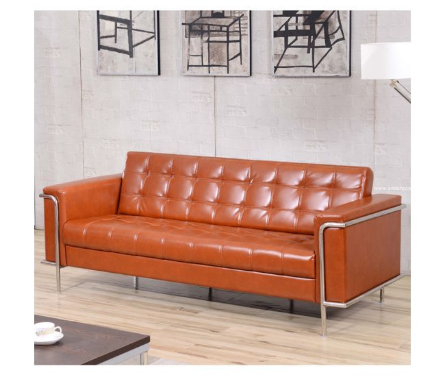 Your office reception space speaks to who your are as a company and this cognac LeatherSoft upholstered sofa with encasing frame makes quite a statement. This trendsetting piece features a straight arm design, and foam filled, tufted, fixed back and seat cushions for exceptional comfort. LeatherSoft is leather and polyurethane for added softness and durability. The integrated stainless steel frame and exposed accent bar not only add style, they are rust resistant and will keep up with the rigors of commercial use. Make a great impression on your clients, customers, and guests with this innovative contemporary sofa. This progressive style seating brings comfort and trend-setting style to your waiting room, reception area or home.