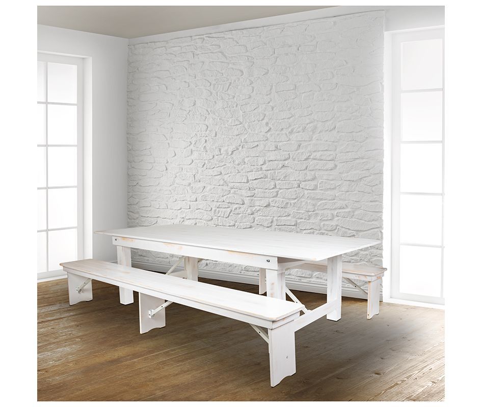 Invite family and friends over to dine in style on your modern farmhouse dining set. This rustic dining table will bring warmth to your kitchen or dining room. The robust design is suitable for the restaurant and hospitality industry. A simple, rustic design and color accentuate this beautiful farm table. The plank dining table is made of solid pinewood and is supported by a thick apron. Both table and benches have folding legs to transport outdoors or to different event locations. Pins pull out to fold the legs that securely lock underneath the tops. The same pins provide extra stability when the table and seats are in use. Bench seating offers a comfortable way for people to sit together in an open design, for home and businesses alike having the sightlines free of chair backs. Although constructed for indoor use, you may enjoy outdoors for special events during good weather. Use a water based cleaner and dry clean to keep your tables spotless. If you're going for a country modern appeal, the 8' x 40" Antique Rustic White Folding Farm Table and Two Bench Set will get you the desired results.
