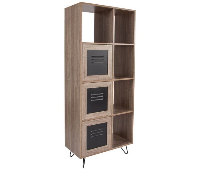 Blending the engineered look of exposed metal and the organic feel of the rustic wood grain finish, this cube storage organizer bookcase is the perfect complement to your mid century or industrial space. 5 open shelving compartments provide plenty of display room for your knick knacks, family pictures or first editions while black locker room style metal doors help you clear away clutter and hide anything you don't want seen. Hairpin style legs add a touch of nostalgia anchoring the whole look.